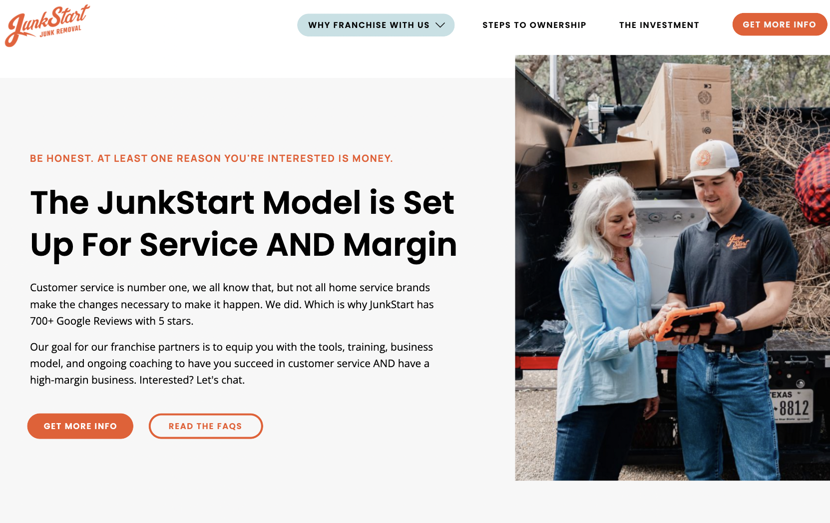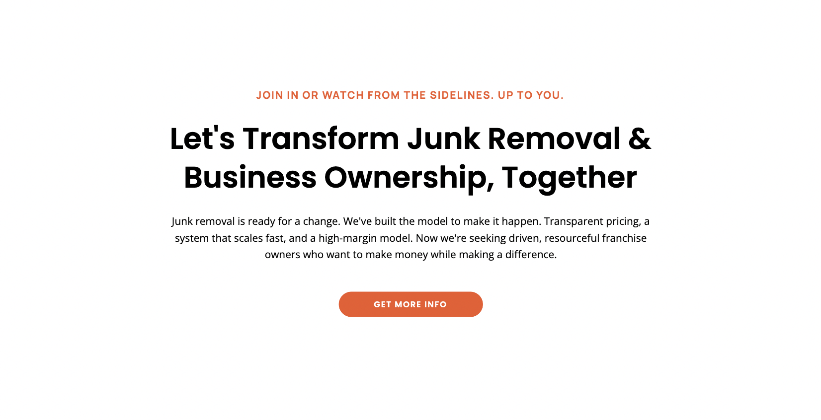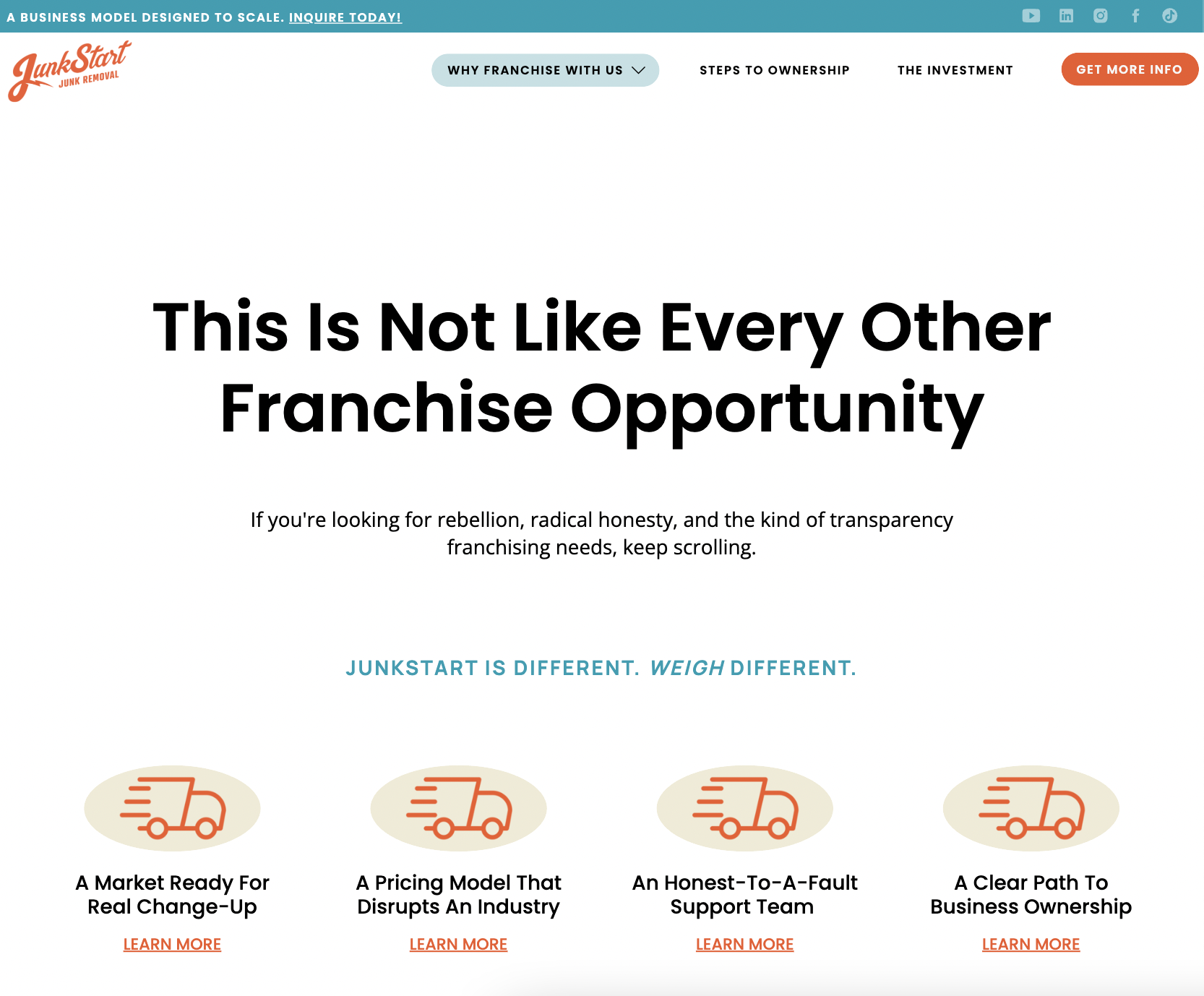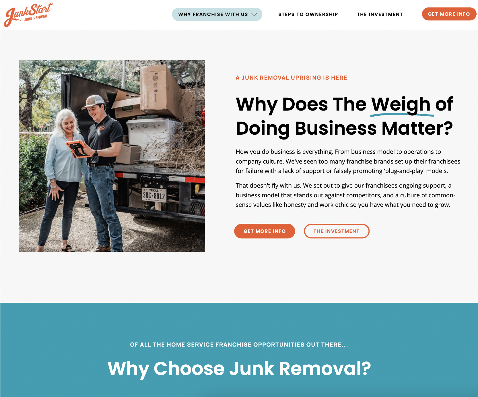This breaks away from the typical franchise website design. No typical franchise imagery. Just a powerful, direct message that immediately sets JunkStart apart.